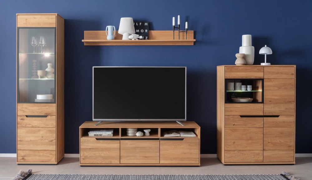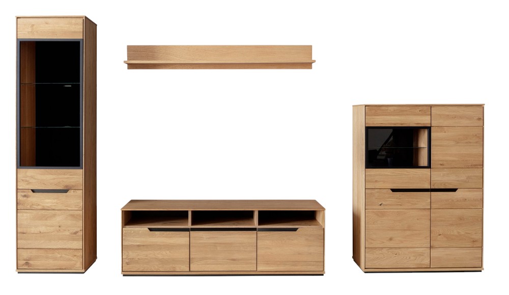 Wohnwand ARAYA W01 ist eine moderne Wohnkombination aus massiver Wildeiche und furniertem Korpusmaterial. Die Anlage besteht aus einer Vitrine, einem TV-Element, einem Wandboard sowie einem Kombi-Highboard. Die harmonische Kombination aus Massivholzfronten, geölten Oberflächen und schwarzen Metallakzenten sorgt für einen natürlichen, warmen Wohnstil. Optional ist eine Glaskantenbeleuchtung erhältlich.