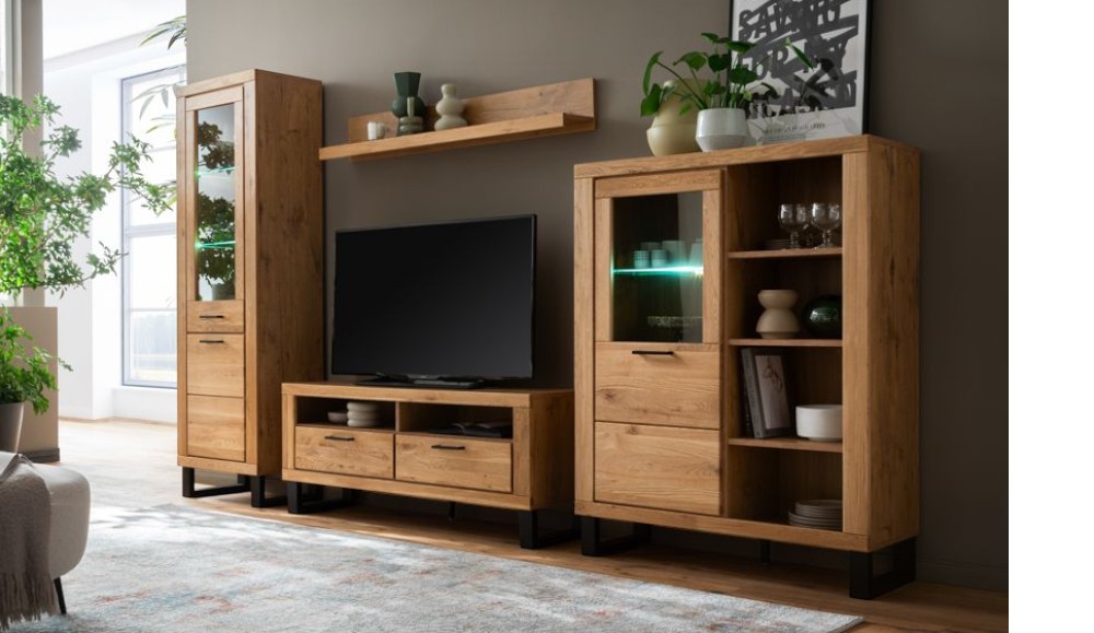 Die Wohnwand KAMBO W01 kombiniert massive Wildeiche-Fronten mit einem warmen, modernen Design. Die Anlage besteht aus einer Vitrine, einem TV-Element, einem Wandboard sowie einem Kombi-Highboard. Die Fronten sind aus geölter Wildeiche gefertigt, während der Korpus in Wildeiche-Nachbildung gehalten ist. Schwarze Metallgriffe und optionale LED-Glaskantenbeleuchtung runden das Gesamtbild ab.